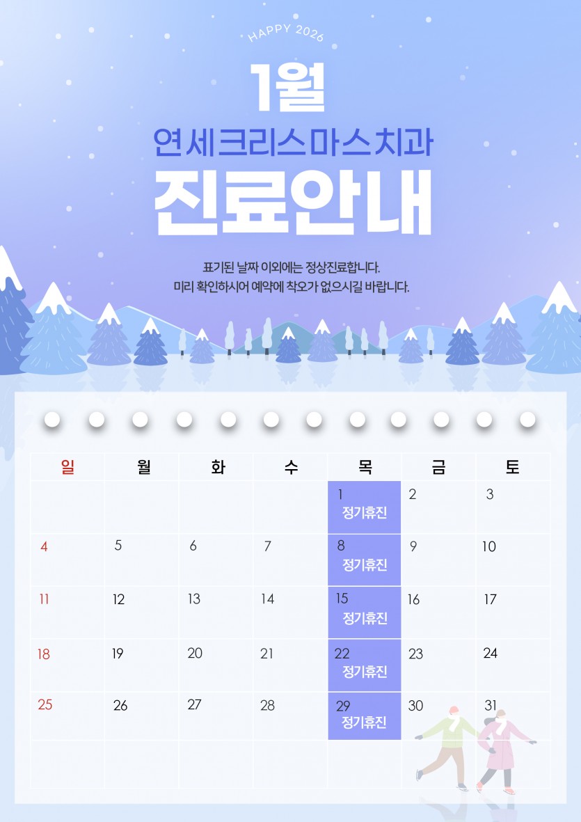 2026년 1월 휴진 안내 페이지 정보 작성자 최고관리자 댓글 0건 조회 220회 작성일 25-12-16 13:49 목록 본문 2026년 1월 휴진 안내 이전글2026년 2월 휴진 안내 26.01.27 다음글2025년 11월 휴진 안내 25.10.24 댓글 0 댓글목록 등록된 댓글이 없습니다.