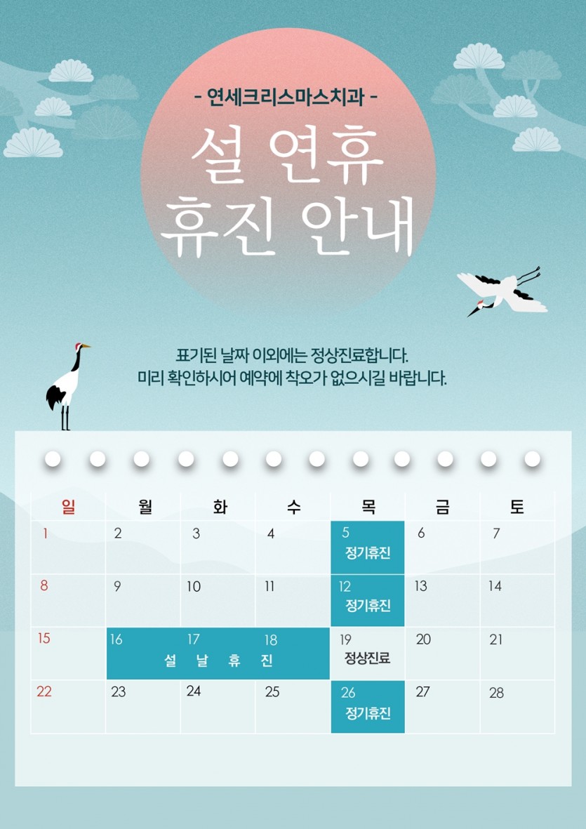 2026년 2월 휴진 안내 페이지 정보 작성자 최고관리자 댓글 0건 조회 29회 작성일 26-01-27 13:53 목록 본문 2026년 2월 휴진 안내 다음글2026년 1월 휴진 안내 25.12.16 댓글 0 댓글목록 등록된 댓글이 없습니다.